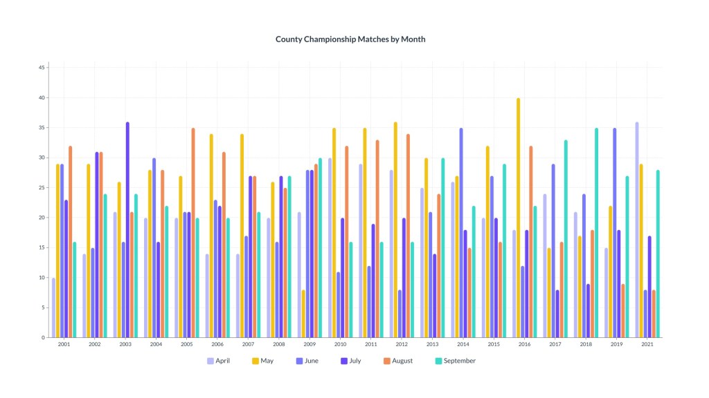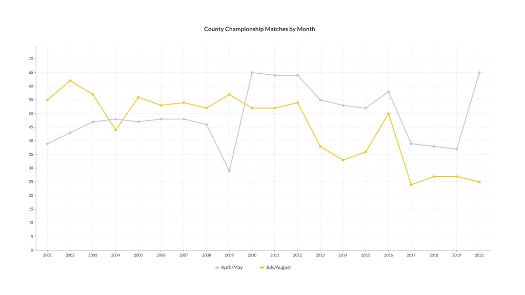 The perception of the County Championship as the least favourite relative at the ECB’s Christmas feast, slotted into the seating plan on the basis of where they are likely to cause the least disruption to the festivities, seems not far off the mark. This, however, is a fairly recent phenomenon. In 2001, the most popular month for Championship matches to start was August, with June and May tying for second place, July in forth, April and September bringing up the rear. By 2021 the calendar had been flipped on its head; April now led the way with May and September taking the silver and bronze, respectively. The sea-change appears to have come in 2010 when matches starting in April and May outstripped those in July and August, a position of superiority that has yet to be relinquished. [In the following tables, statistics from 2020 have been omitted due to the truncated season].