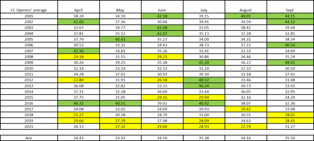 What is noticeable from the raw numbers is that the month of April brings with it the largest variations in openers’ averages, followed by September; May and August the smallest. Here may lie the detail that belies the apparent similarity of month-by-month averages – that the difficulties of opening in the extremes of the season is the inconsistency the conditions can bring (and before you ask, there is no apparent correlation with monthly rainfall totals).