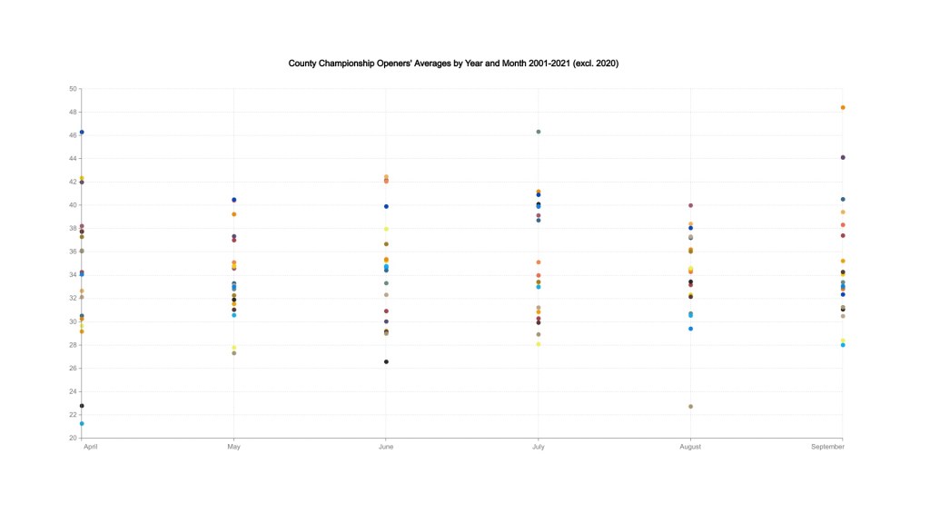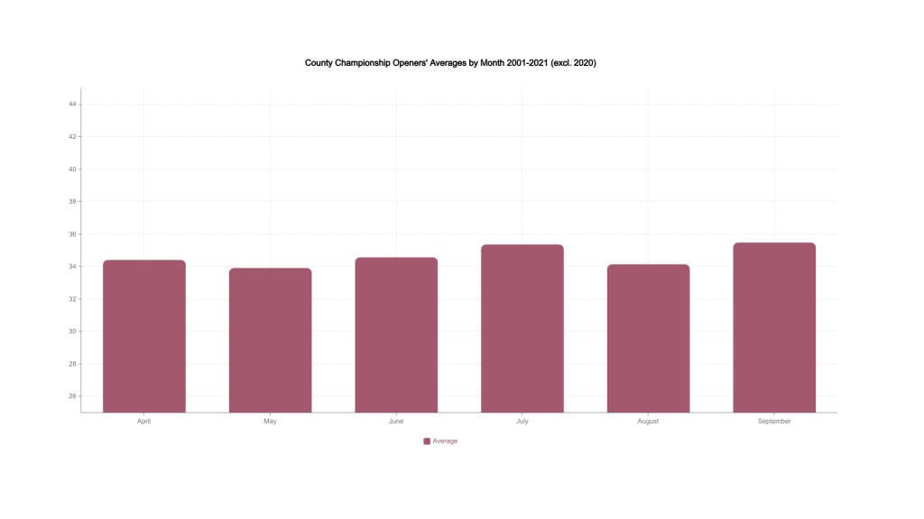 At first glance, the numbers do not appear to back up this orthodoxy. Looking solely at openers in the County Championship – on the basis that if this hypothesis is true, that is where it should be evident – there is very little difference in the combined averages when separated out by the month in which the match started. September was the most prolific month over this twenty year period with openers averaging 35.5. However, the worst performing month in the same period was May, which clocked in at 33.93. Hardly a dramatic difference.