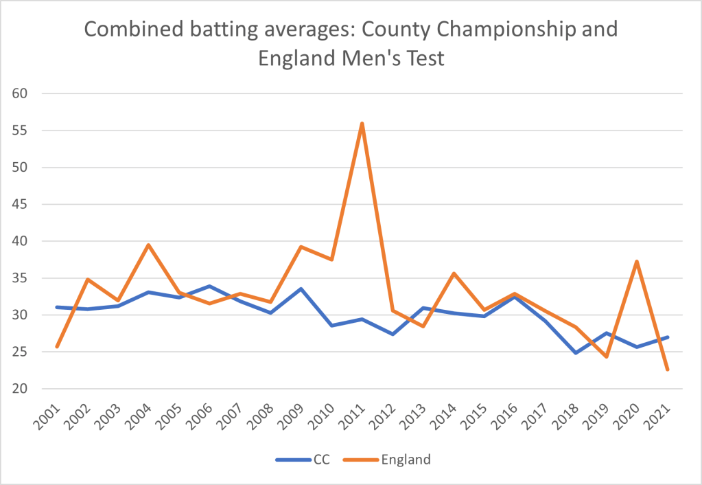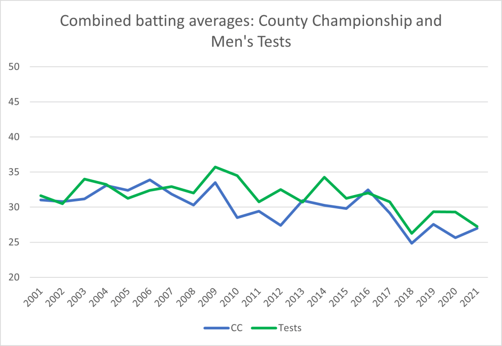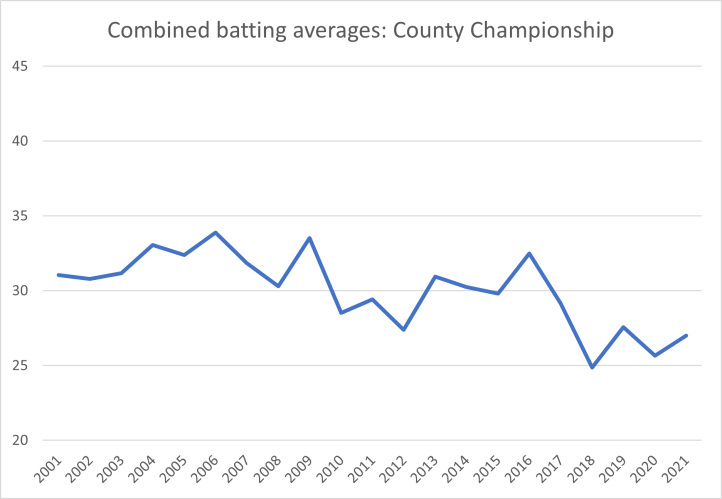 At first glance, the criticism is not unfair; averages in the County Championship over the last five years or so have been low, hovering just above the 25 mark for all players and around 30 for those in the usual specialist batting positions of one to six.