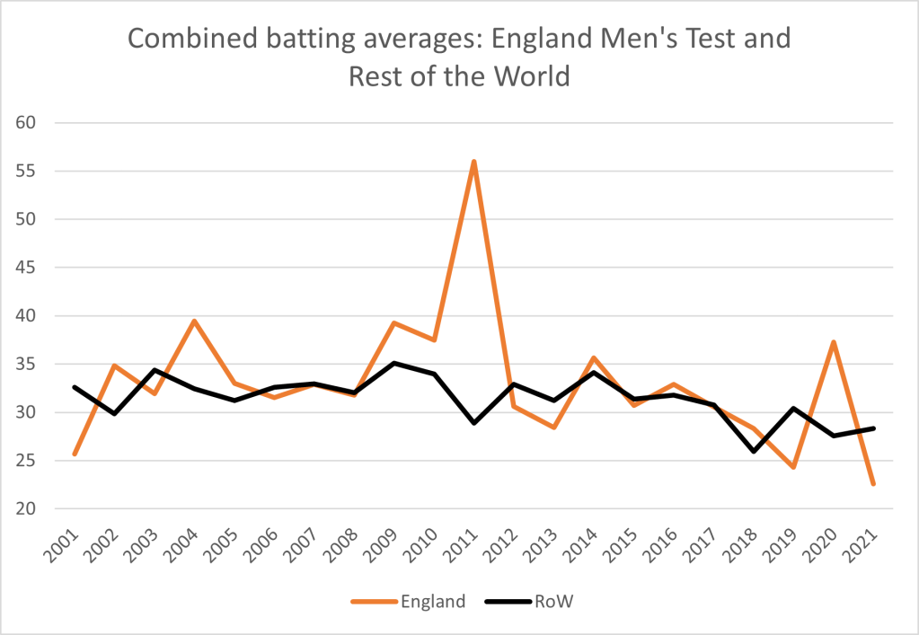Possibly, but here the case is not so clear. There has been a similar decline in averages since 2014 but England’s performances have been much more erratic over the last twenty years and, looking at the specialist batters, other than a brief spike in Covid-impacted 2020, consistently below the other nations since 2012. The correlation between averages of England and the rest of the world at Men’s Test level for the whole team comes out at 0.06 and at 0.24 for the top six; i.e. non-existent and very weak. England’s averages seem to dance to their own tune.