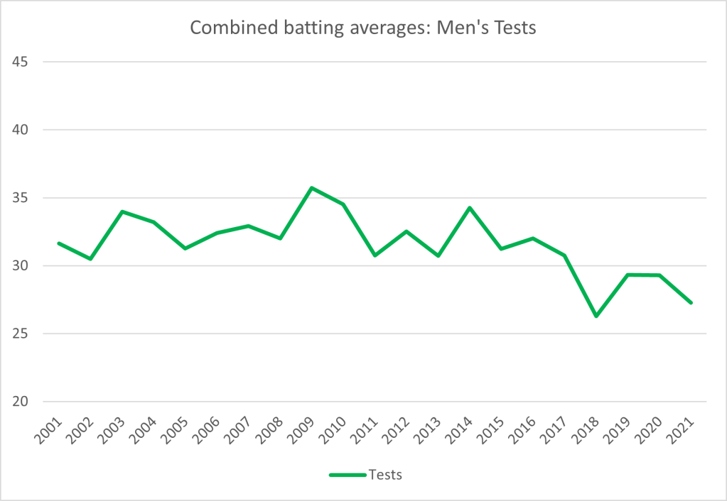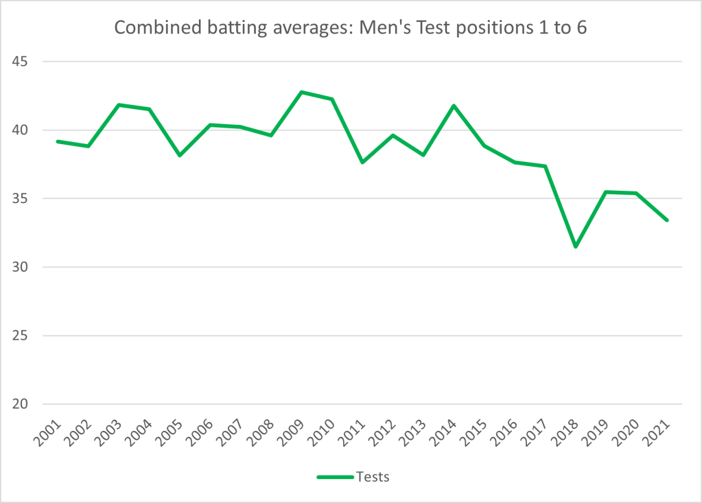 Advocates of fundamental change will point to the recent struggles of England’s Men’s top order who, Joe Root aside, seem incapable of anything other than the odd flash-in-the-pan innings. Can we mitigate this by the general downslope of Men’s Test scores across the board?